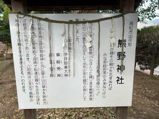 当社は紀州熊野神社の分霊を奉斎(ほうさい)して、この地方鎮護の神としたものですが、古書に、「出作の東、東原に位置し、祭神は伊装諾命(いざなぎのみこと)およびその他二柱で由緒は不詳」と記載があるように、由緒はよくわかっていません。勧請(かんじょう)の年月も不明です。